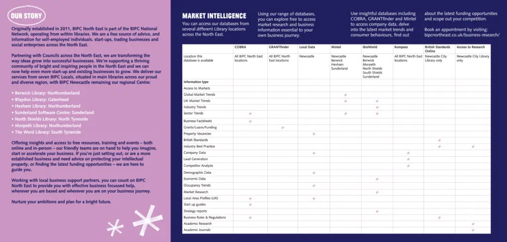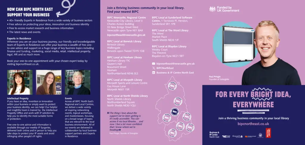 Business and Intellectual Property Centre – North East can provide free advice, information and training to local self employed people, start-ups and trading businesses. The nearest access point is Hexham Library in the Queen’s Hall on Beaumont Street in Hexham.